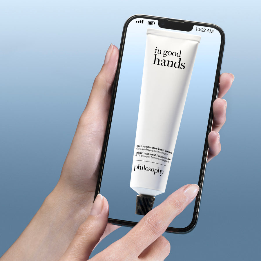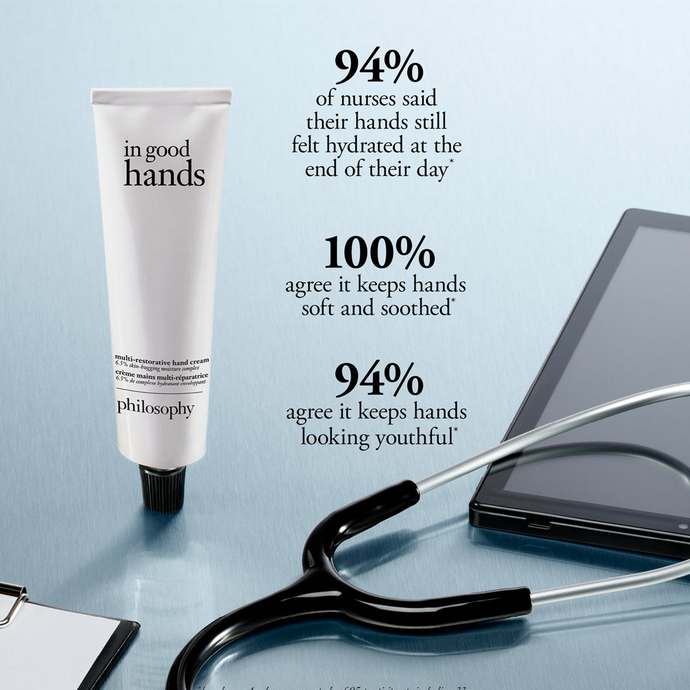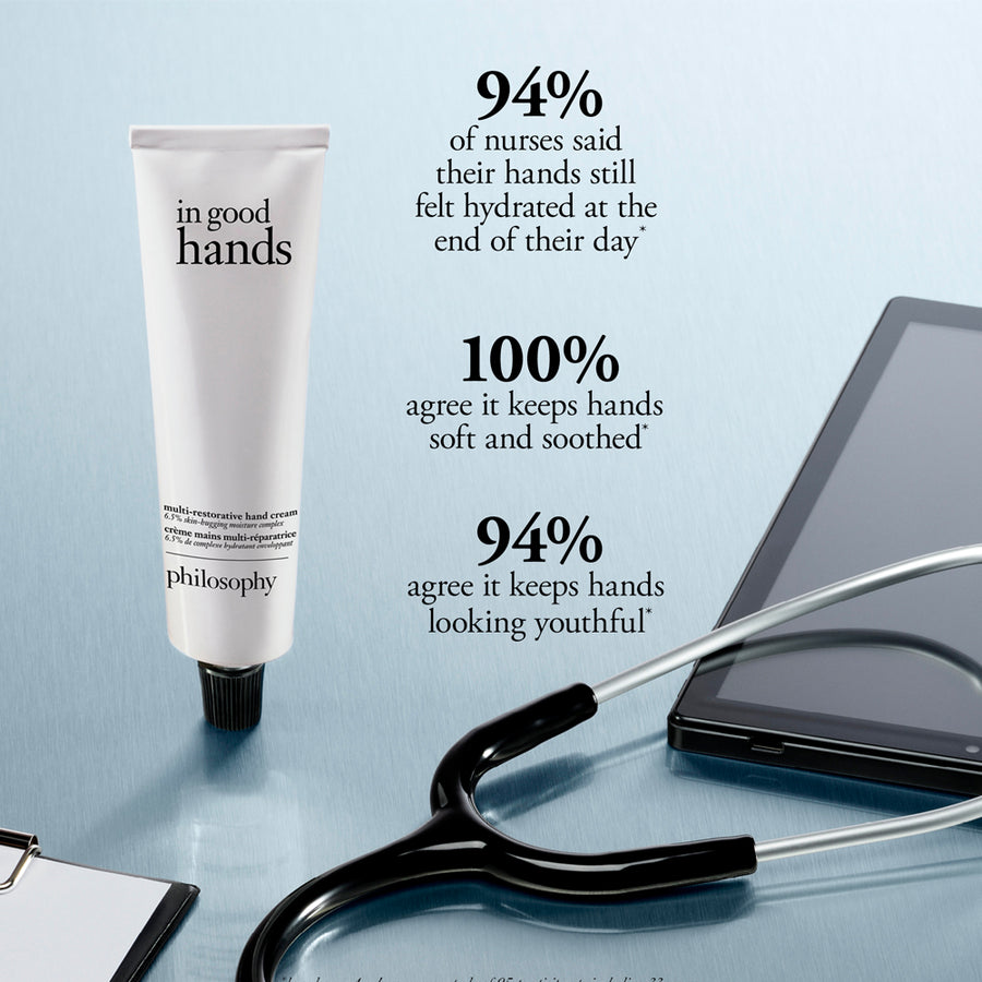 in good hands multi-restorative cream. a skincare-powered hand cream that hydrates all day, lasting even through handwashing.