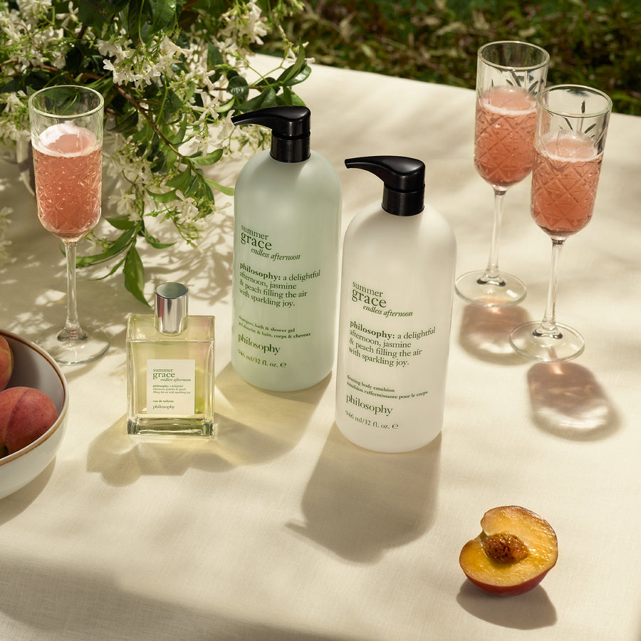 find a moment of summer joy with our new, limited-edition philosophy summer grace endless afternoon hydrating shower gel. notes of sparkling peach, blooming jasmine, and sandalwood transport you to a sun-drenched garden party. the floral peach perfume captures the joyful energy of a laughter-filled afternoon under the sun with your closest friends.